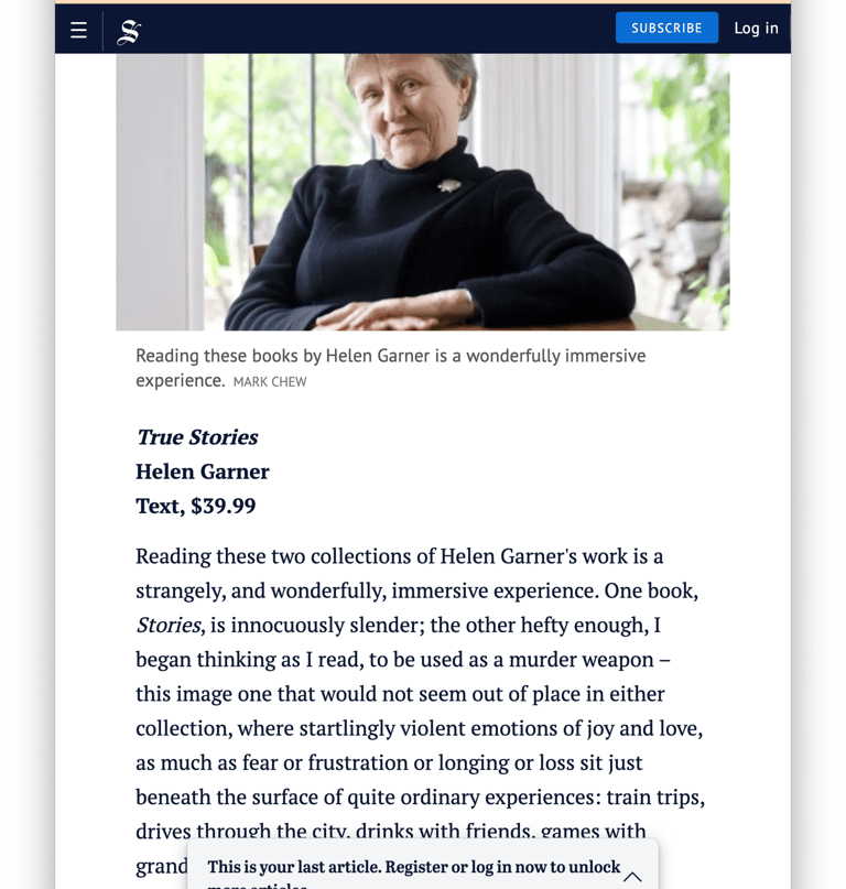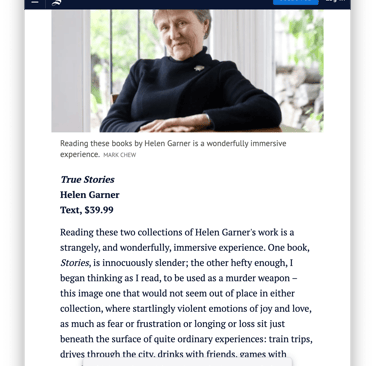 Read the whole article at: https://www.smh.com.au/entertainment/books/stories--true-stories-review-the-joys-of-heartbreak-and-hope-with-helen-garner-20171207-h00g4e.html